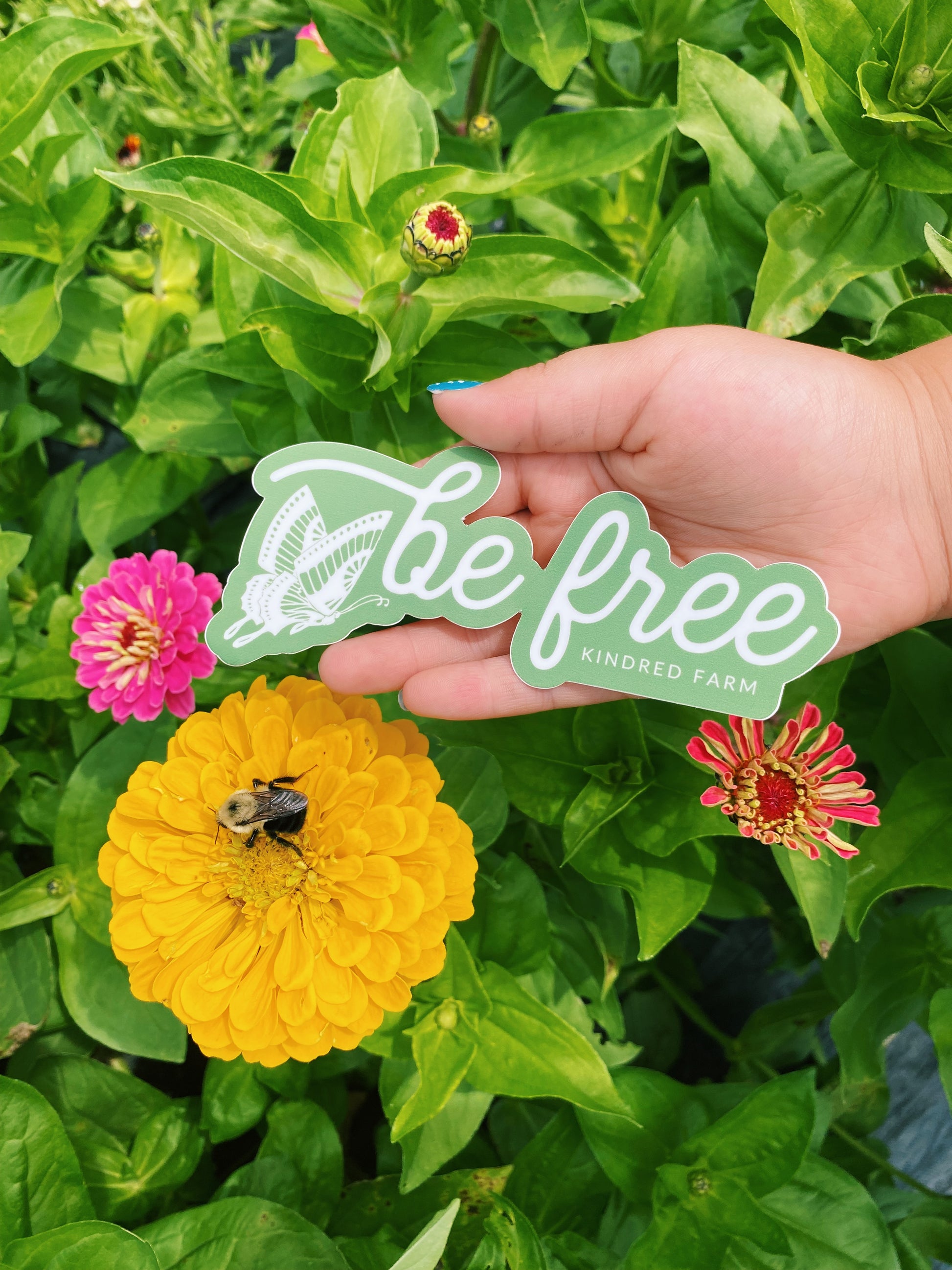 High quality vinyl sticker with a butterfly and one of our main mottos here on Kindred Farm - BE FREE. We love being a healthy home for pollinators and also a place where people can be free to be who they were created to be. Freedom to move around. Freedom to slow down and connect. Put this sticker on your water bottle, laptop, car window, or wherever - to remind you that you are FREE. Light green and white. Approximately 5" wide.