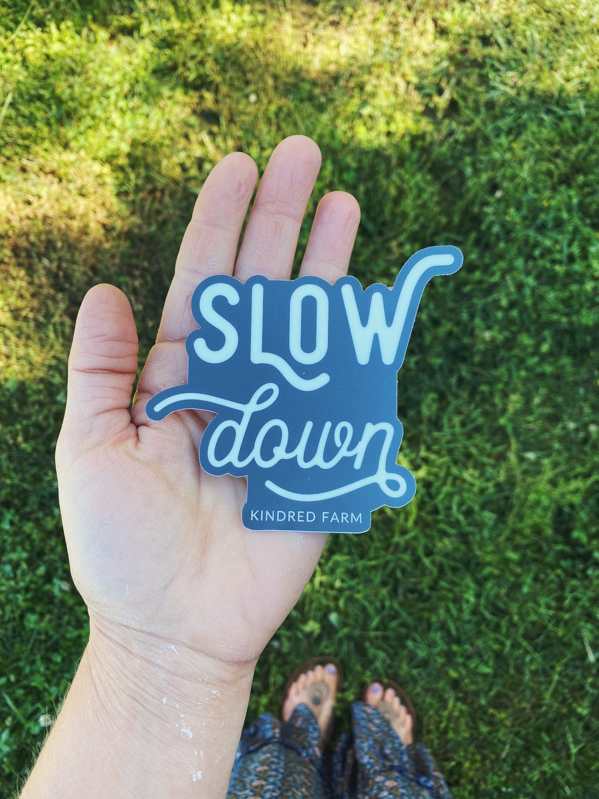 High quality vinyl sticker with one of our main mottos here on Kindred Farm - SLOW DOWN. We love being a place where people can slow down, exhale, and soak up beauty and connection. Put this sticker on your water bottle, laptop, car window, or wherever - to remind you to slow down and soak up the good and beautiful things in life. Charcoal gray and white. Approximately 4" wide.
